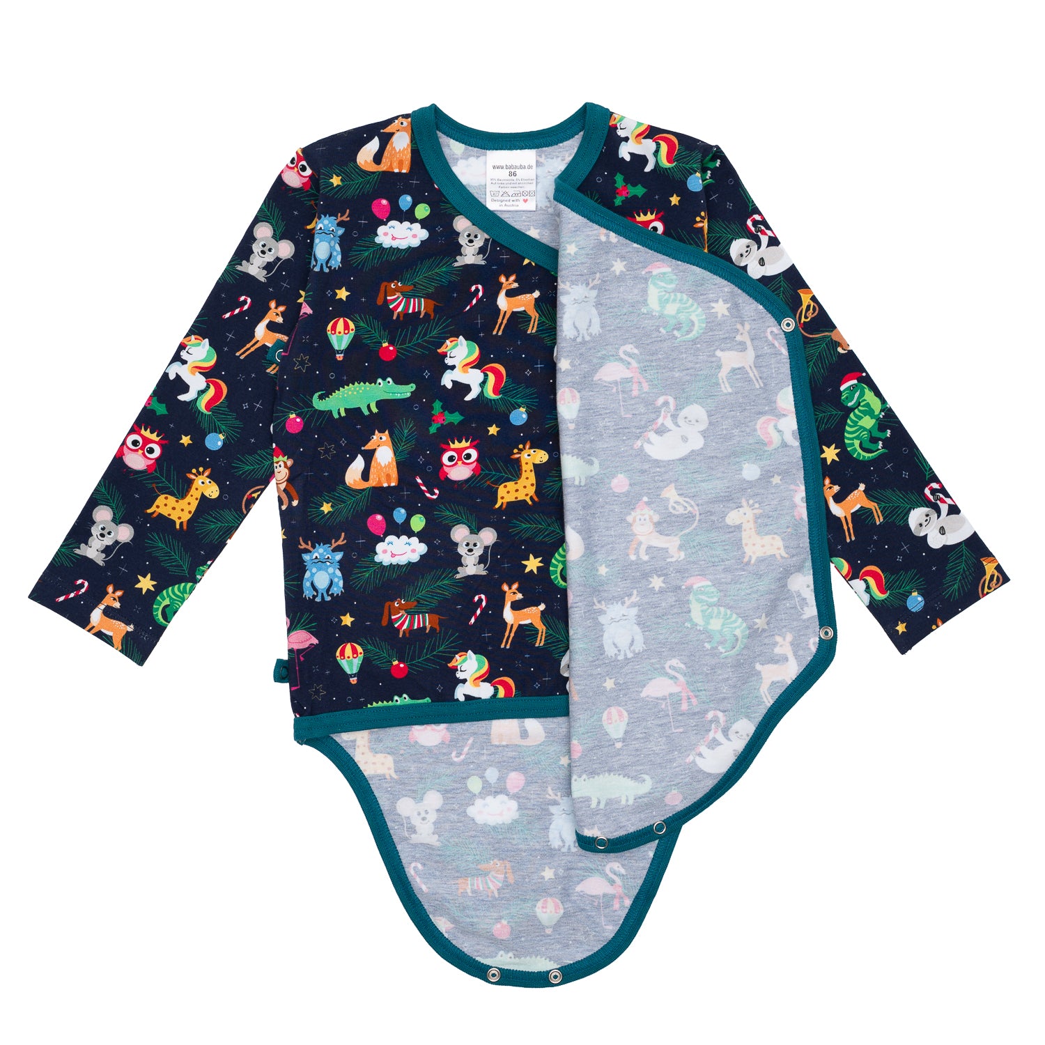 This practical wrap bodysuit, made from soft, brightly patterned cotton jersey, allows for quick and easy dressing and undressing, and therefore also quick diaper changes. The snap closure opens completely from the side and is perfectly color-coordinated.